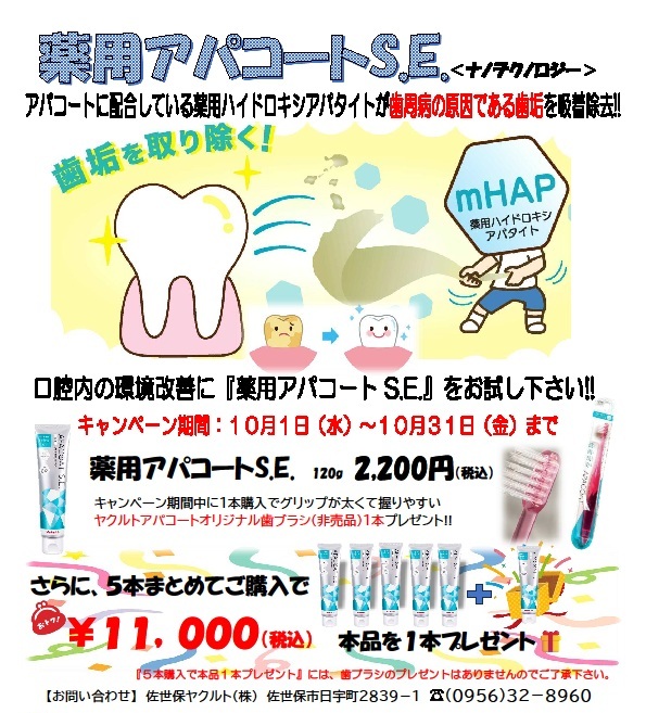 『薬用アパコート S.E.(歯磨き粉)』お試しキャンペーン!!by 佐世保ヤクルト2025年9月29日2025年9月26日ヤクルト薬用アパコートS.E.<ナノテクノロジー>をお得にご購入いただけるチャンス 薬用アパコートS.E.<ナノテクノロジー>には 薬用成分「薬用ハイドロキシアパタイト(むし歯予防成分)」が配合されています。